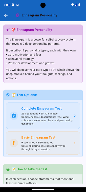 Understand Your CharacterThe app combines several psychological approaches for a deeper self-analysis: